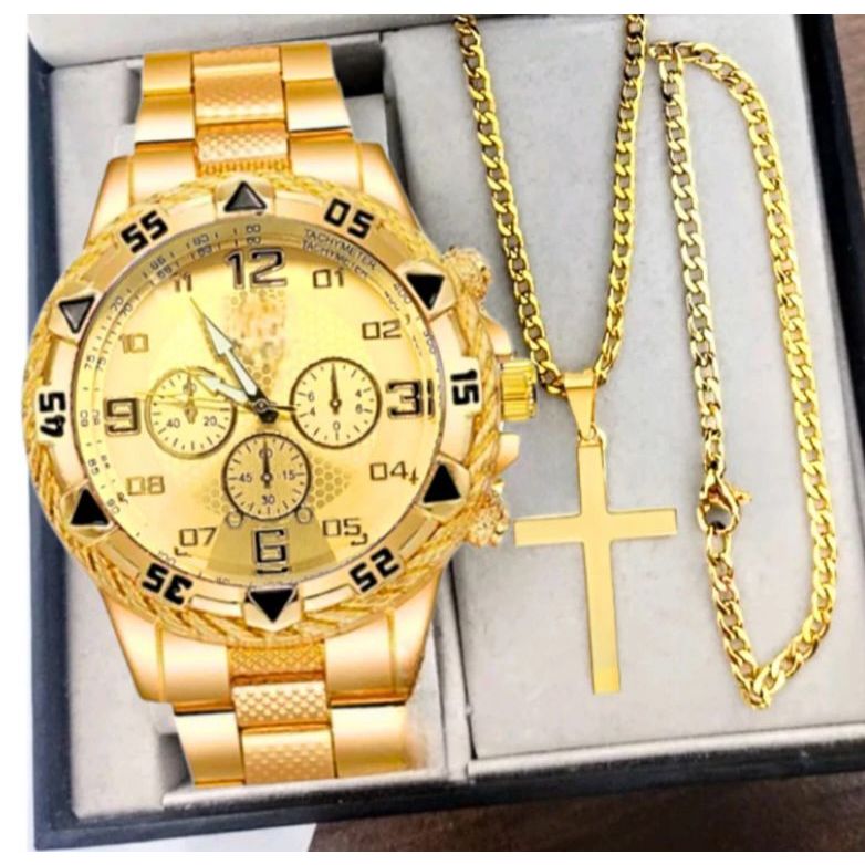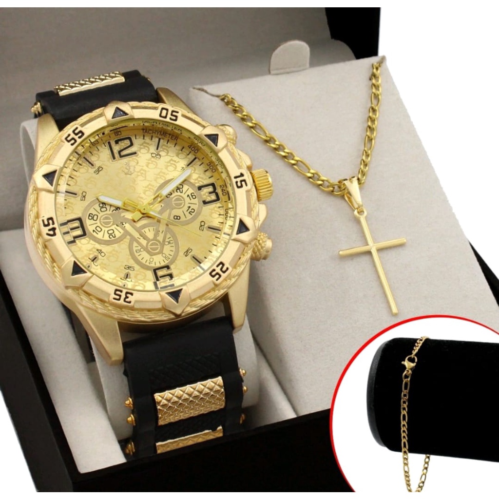 Kit Relogio Masculino + Corrente Cruz 18k Banhado a Ouro Original