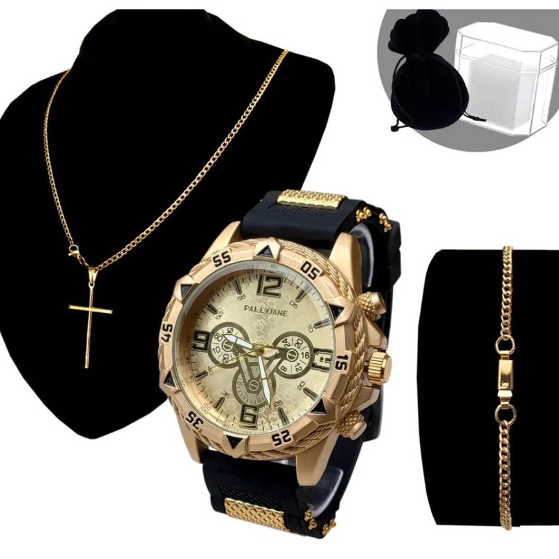 Kit Relógio Masculino Banhado a Ouro 18k Dourado + Corrente em Aço Banhada 18k Masculina + Pulseira e Pingente