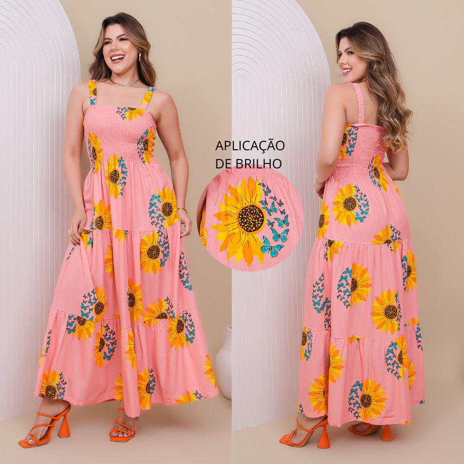 Vestido Longo Viscolinho Busto em Lastex Saia com Babados Alças com Elástico Estampado