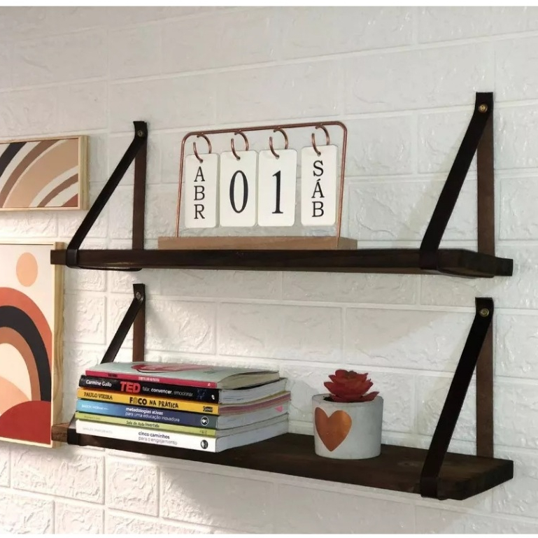 Kit 2 Prateleiras Madeira Rústica com Tiras de Couro Para Decorar Quarto Sala Cozinha Banheiro
