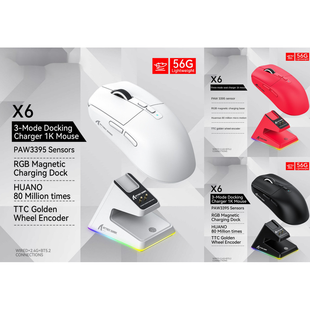 2024 Explosão de comércio exterior Ataque Shark X6 Mouse R1 Leve PAW3395 E-sports Jogo 2.4G Três Modos Sem Fio Bluetooth Mouse RGB Base de carregamento