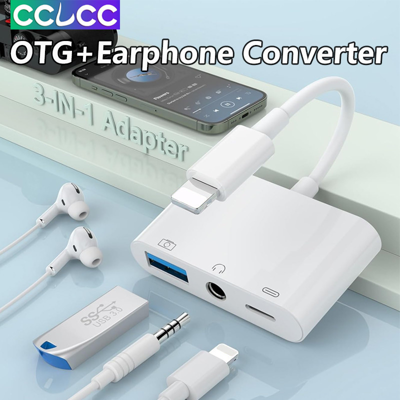 CCLCC USB OTG + Adaptador AUX De 3,5mm Para Relâmpago , 3 Em 1 Conversor Multifuncional i-Phone 14 13 12 Pro Max XR/Pad Air to U Disk/Mouse/3,5mm Jack Fone De Ouvido Com Porta De Carregamento Rápido