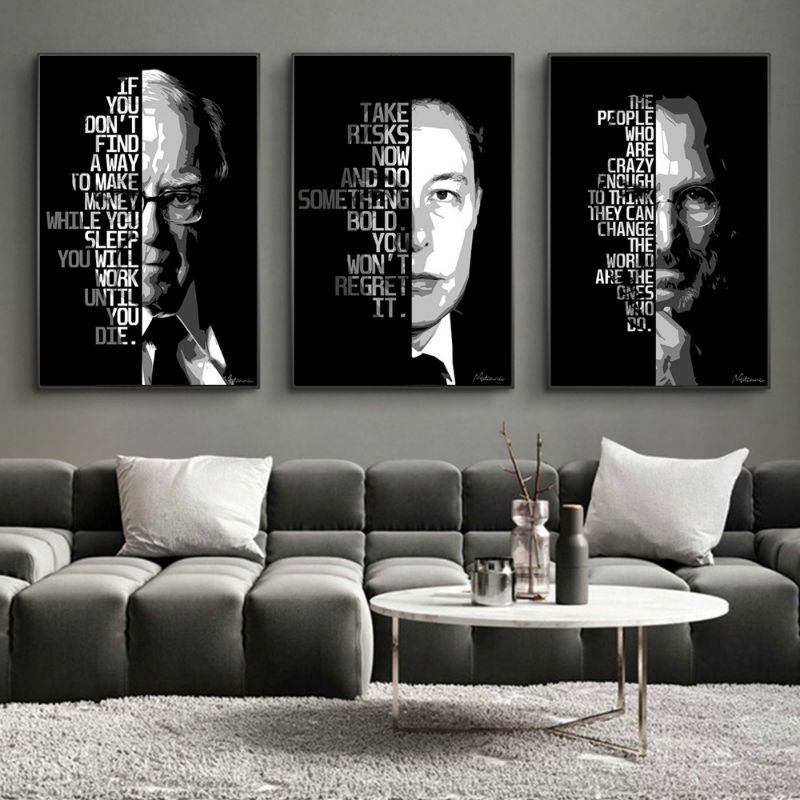 Quadro decorativo steve jobs,nikola teslta e elon musk visionarios foco execuçao e disciplina 3 peças parra sala quarto cozinha e escritorio 3 peças