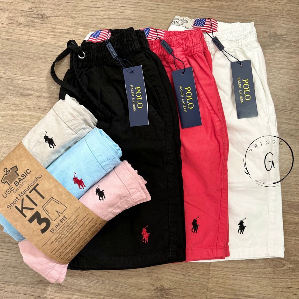 kit com 3 Bermudas Shorts de sarja Masculina Com Amarração e Elástico Short