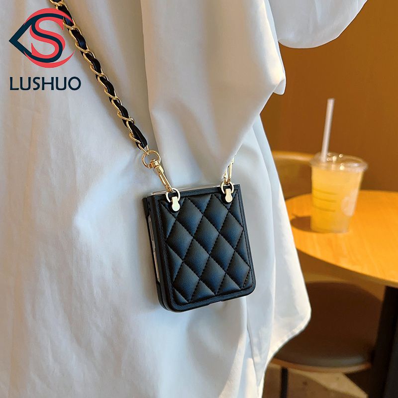 Capa Traseira De Couro LUSHUO Para Samsung Galaxy Z Flip 5 4 3 Luxo Rhombus Com Cordão Flip5 ZFlip5 ZFlip 5 Flip4 Flip3 ZFlip4 ZFlip3