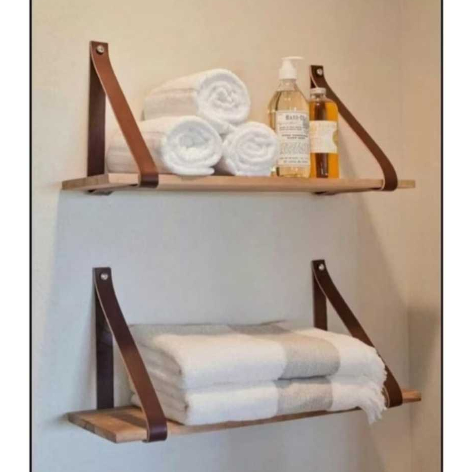 Kit 2 Prateleiras MDF Branco com Tiras de Couro Para Quarto Sala Cozinha Banheiro Decoração de Interiores