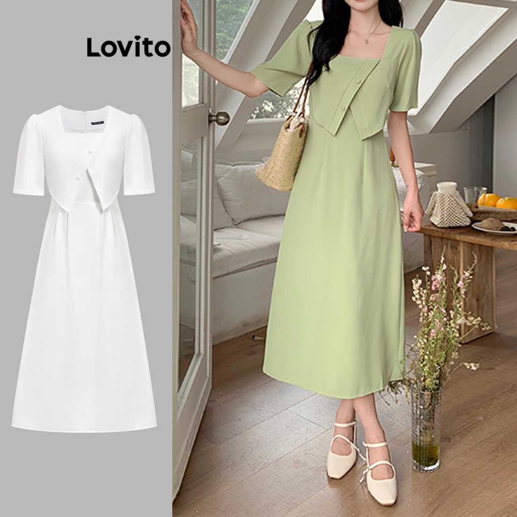 Lovito Elegante Vestido com Fenda e Botões Falsos 2 em 1 para Mulheres L74ED187