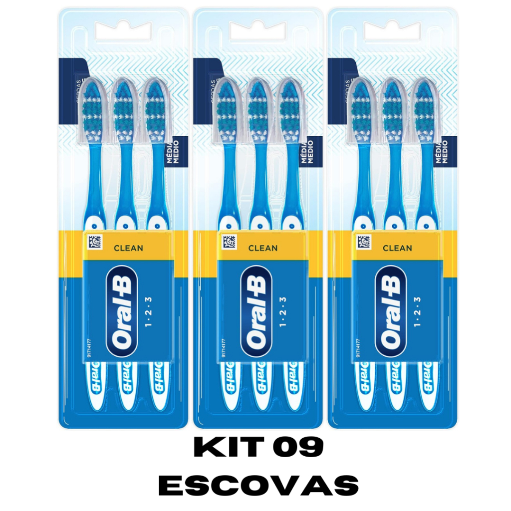 Kit 09 Escovas Dental Media Oral-B 1 2 3 Clean - Cores Sortidas