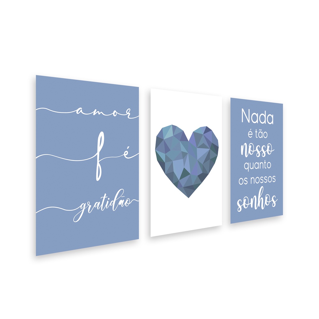 Kit 3 Placas Quadros Decorativos Fé Coração Azul 20x30cm