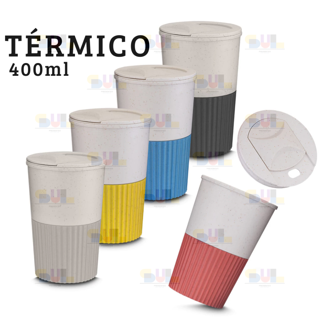 Copo Fibra De Bambu 400ml Com Tampa Rosqueável Parede Dupla E Alça De Nylon