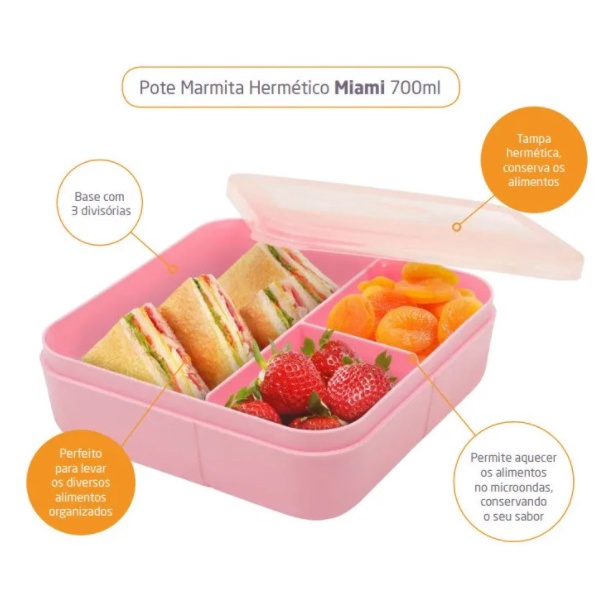 Pote Hermético Marmita Dup 700ml com 3 Divisórias Miami Papinha Lanche Vasilha Free BPA Lanchinho