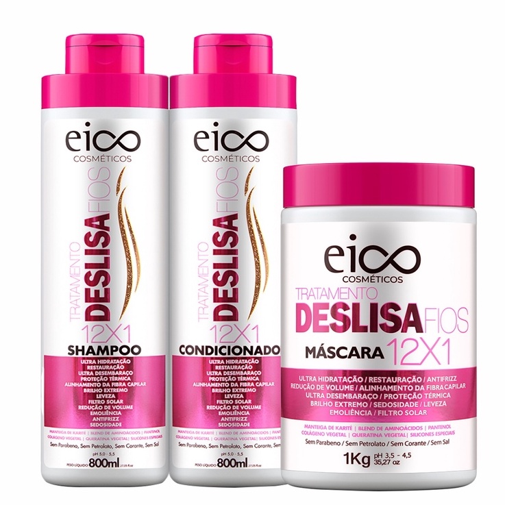 Kit Eico Deslisa Fios Shampoo e Condicionador 800ml + Máscara Antifrizz Hidratação Redução de Volume Brilho Filtro Solar Proteção Térmica Sem Sal 1kg