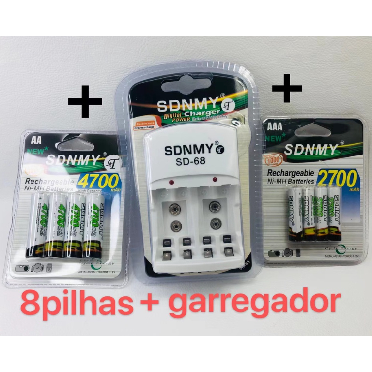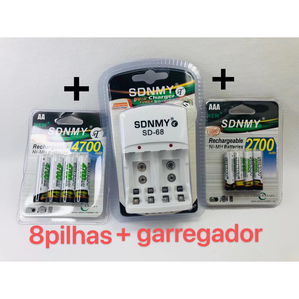 KIT 8 Pilhas Recarregável de AA 4700mAh AAA 2700mAH com Carregador de pilha bateria