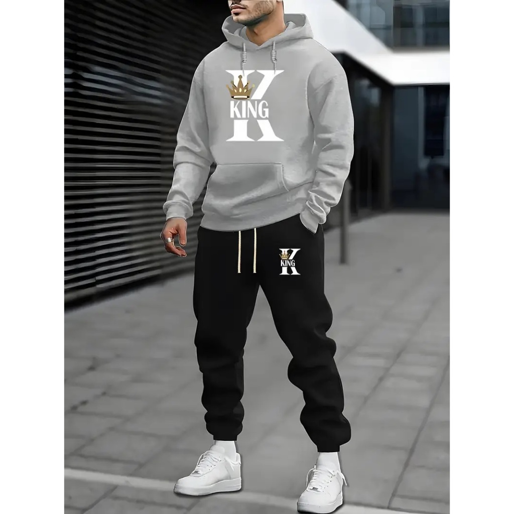 Conjunto de Moletom Masculino com Calça Preta e Blusa Cinza Estampado