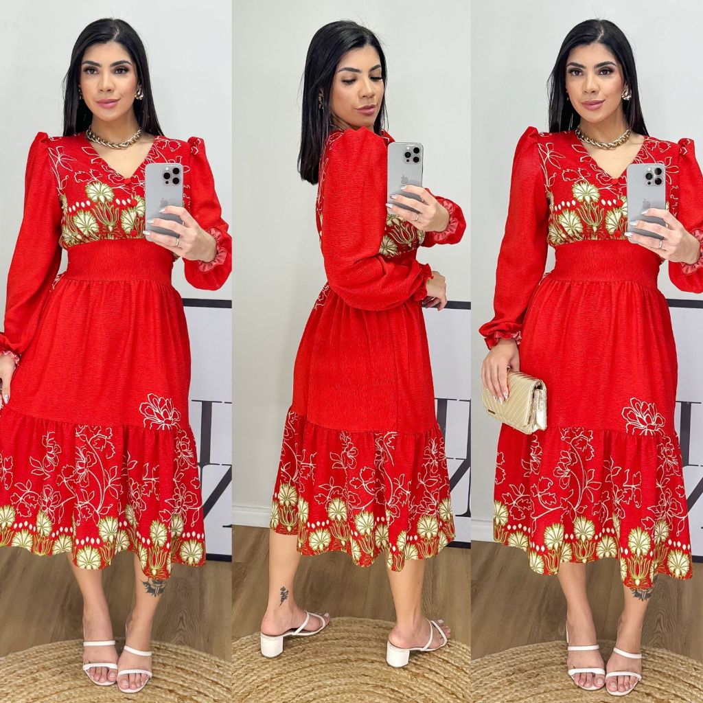 Vestido Midi Feminino Estampado Floral com elastex nas costas / manga longa / gola V