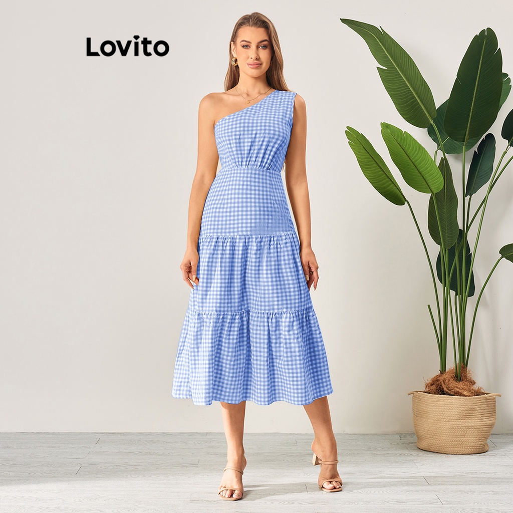 Lovito Vestido Casual Xadrez Assimétrico com Babados em Camadas para Mulheres LBL06107 (Amarelo Claro/Azul)