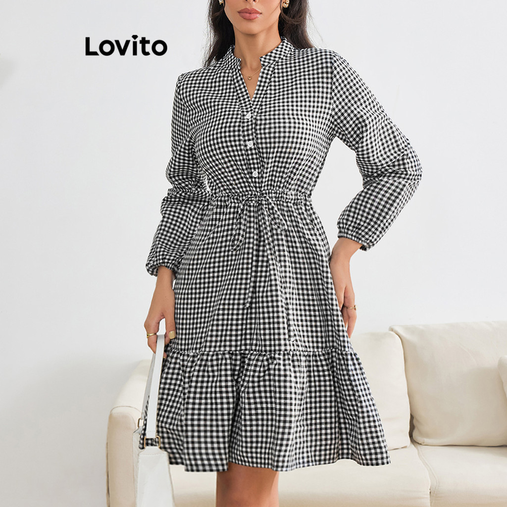 Lovito Vestido casual xadrez com botão frontal em cascata para mulheres LBL12119