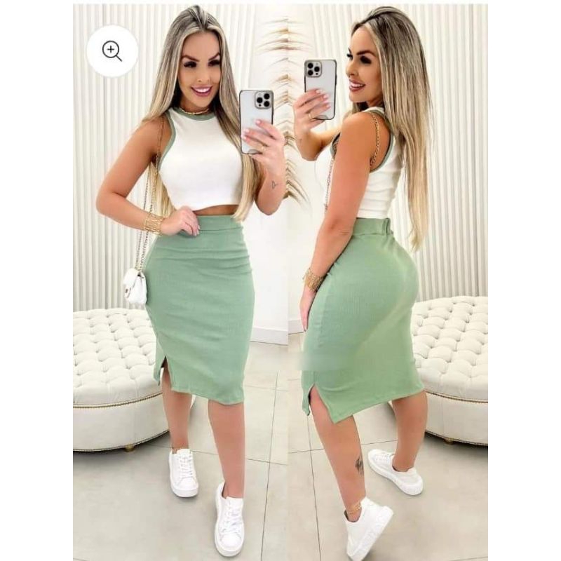 Conjunto Cropped e Saia Midi Com Fenda Anarruga Canelado PRETO ROSA VERMELHO ROXO BRANCO LISTRADO NUDE