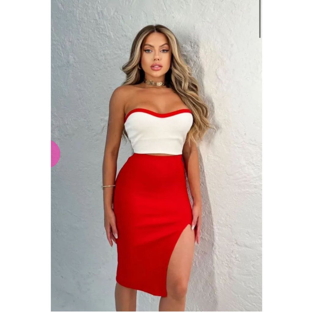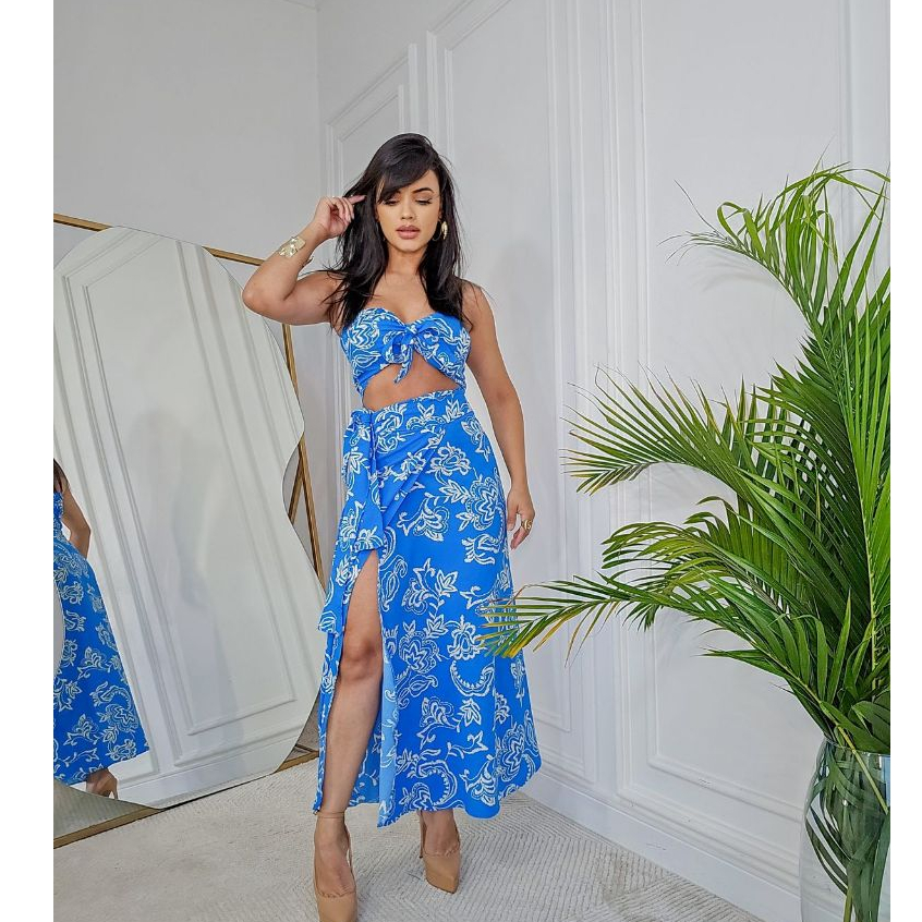 Conjunto Feminino Saia Midi Com Fenda + Cropped Tomara Que Caia Com Bojo Tendência 2024