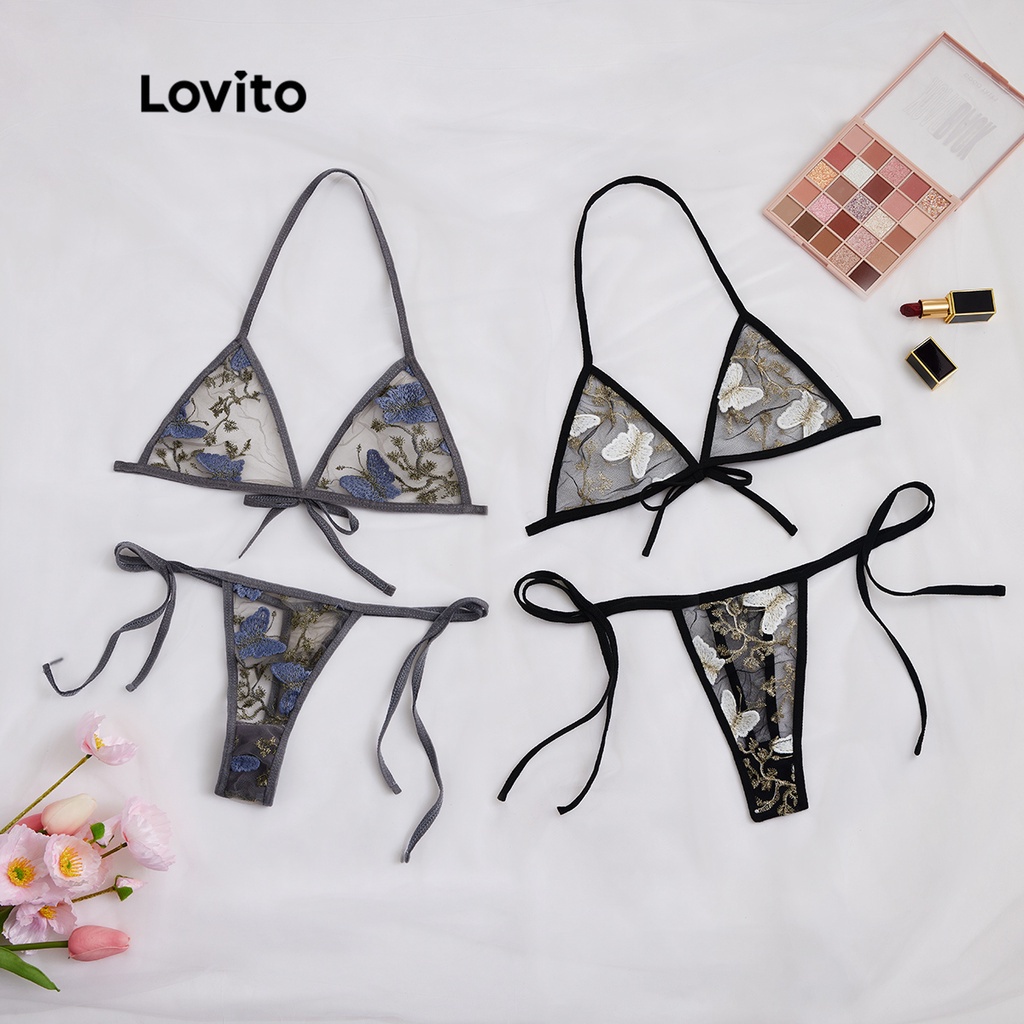 Lovito Lingerie Sexy de Borboleta de Amarrar Transparente Triangular Sem Enchimento Sexy L17X445 (Cinza/Preto)