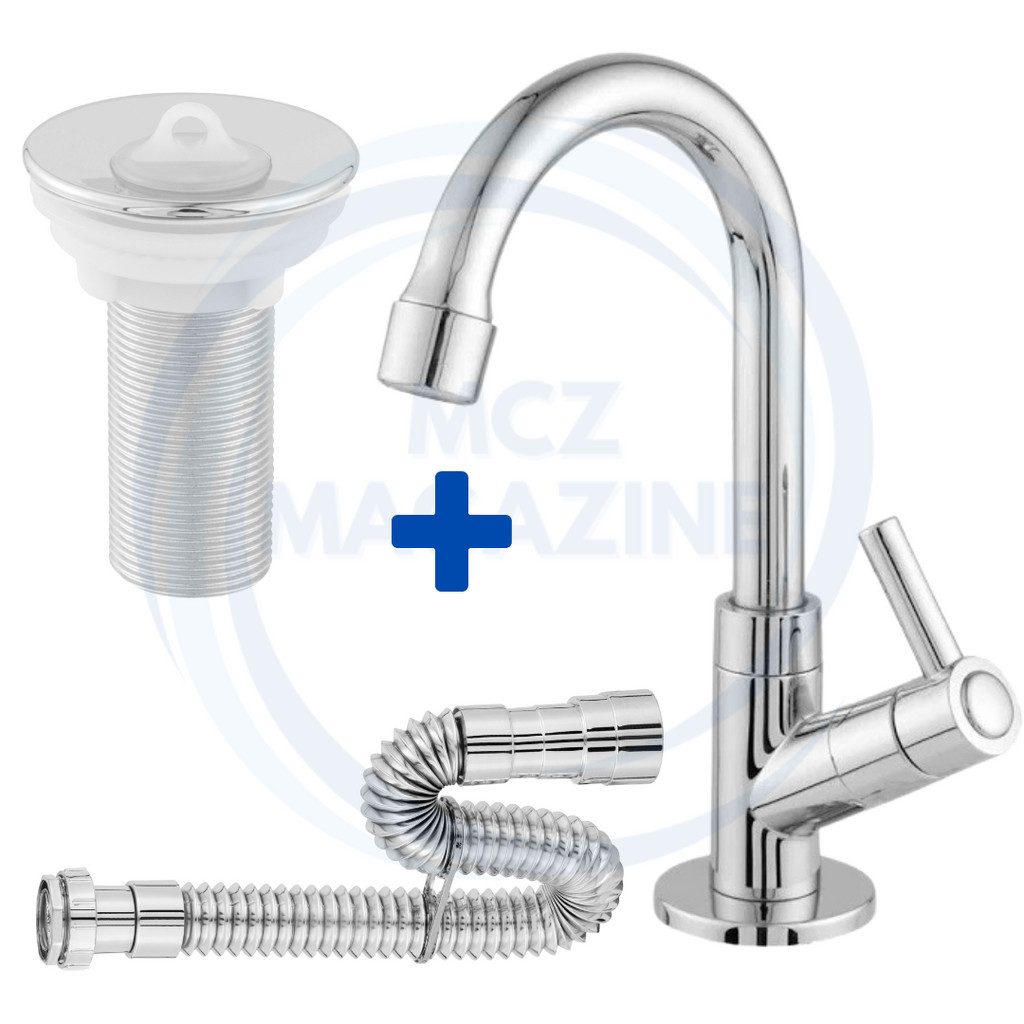 KIT Torneira Pia de Banheiro Cromada ABS + Valvula 7/8 Cromada + Sifão Universal Cromada