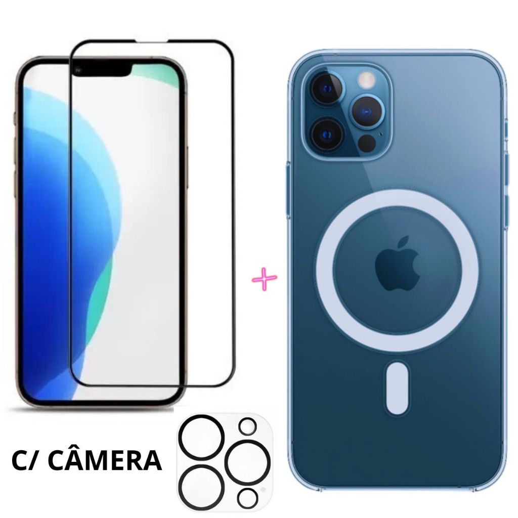 Kit Protetora Película 3D + MAGSAFE CLEAR - Capa Capinha Magsafe Transparente Carregamento Por Indução para iPhone 11 12 13 14 15 Pro Max Plus ProMax