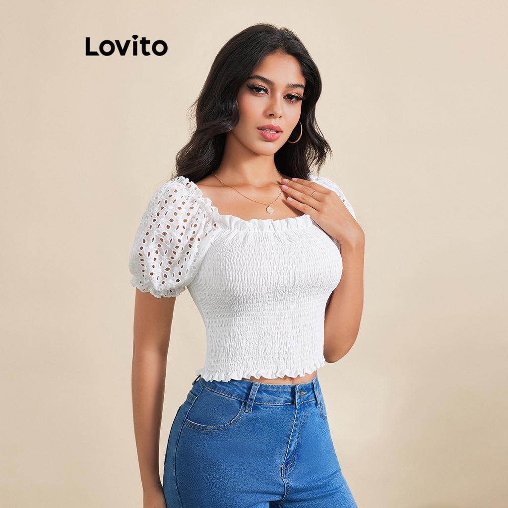 Lovito Blusa Elegante Com Costura Em Tecido Liso E Bordado Com Ilhós Para Mulheres LBE03124 (Branco)