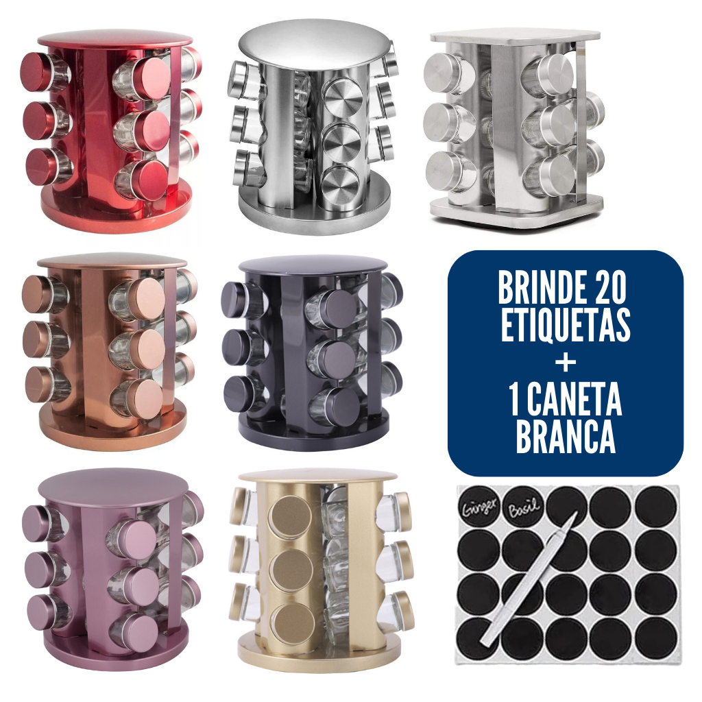 Porta Tempero Condimentos Inox Giratório 12 Potes Acompanha 20 Etiquetas + 1 Caneta Branca