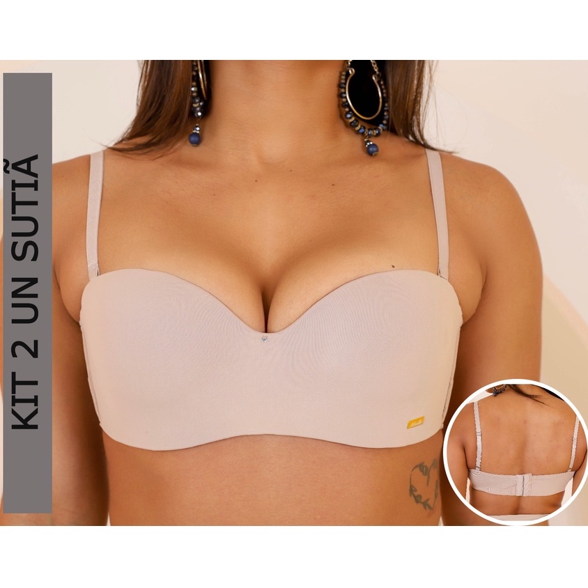 Kit 2 UN Sutiã Tomara que Caia Bege com Bojo Sutian Bustie Feminino Reforçado + Par de Alça Removivel