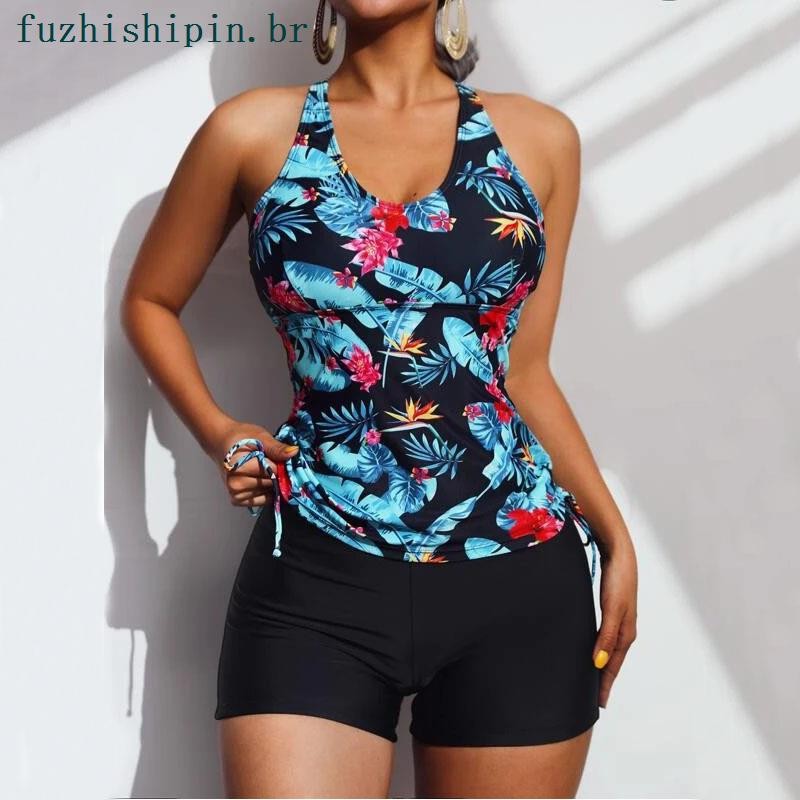 Tankini Feminino Impressão Tropical Conjuntos De Biquíni De Cintura Alta Com Calções Fatos De Banho De Verão Floral Praia