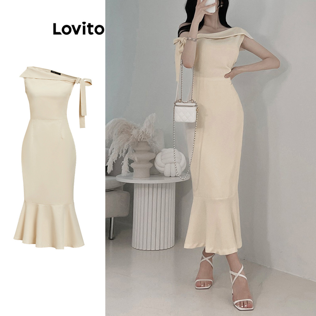 Lovito Vestido elegante liso com ombros descobertos e babados na bainha para mulheres L109MD458