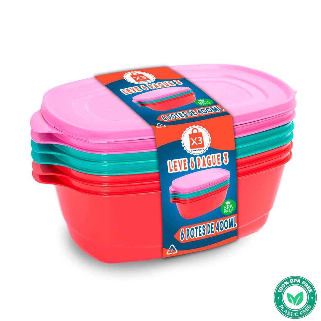 Kit com 6 Potes De Plástico Herméticos Microondas Freezer Marmita com Tampa para Cozinha de 400 ML