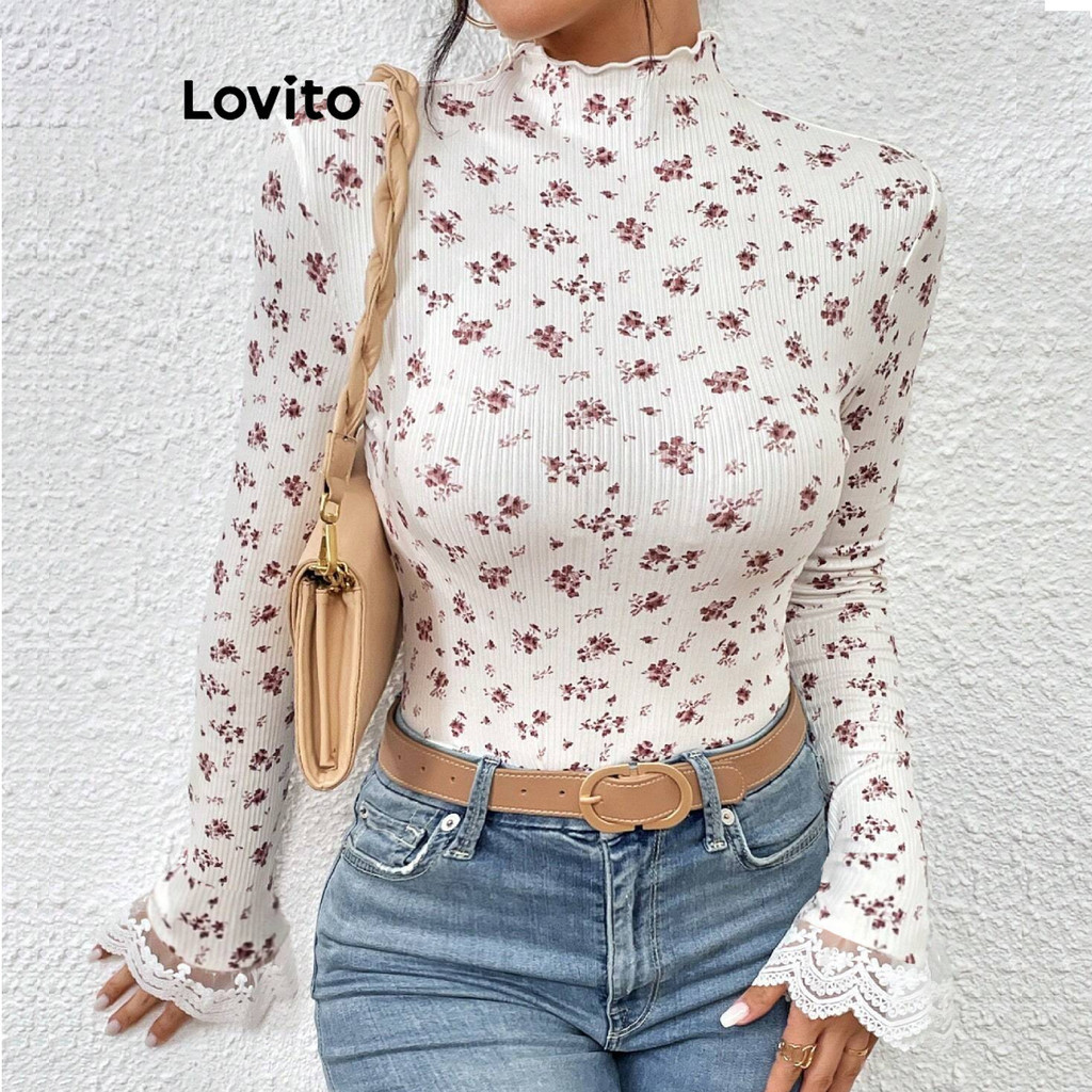 Lovito Camiseta feminina romântica Ditsy com renda floral LBL12252