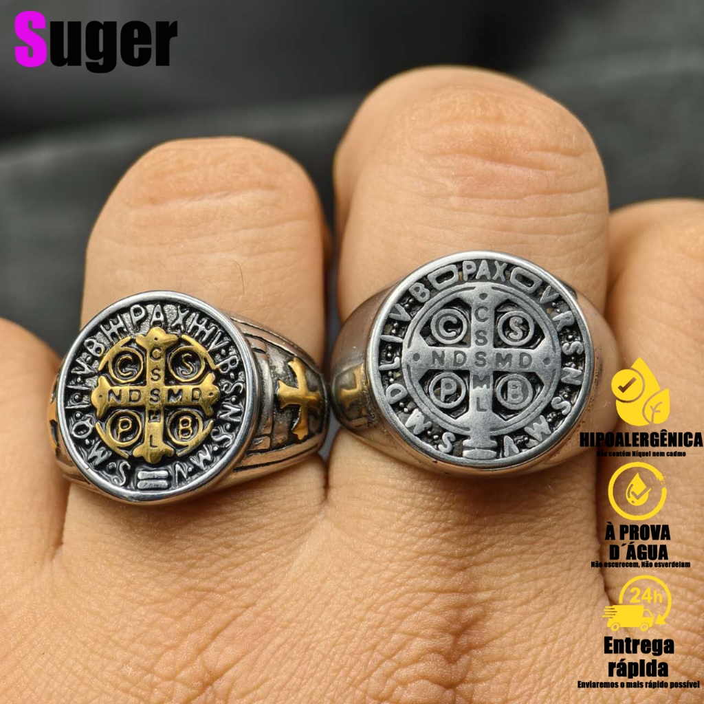 Anel São Bento Cravejado Com Medalha Cruz De Dedeira Masculino Em Aço Inoxidável Banhado A Ouro 18k