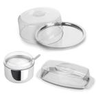 Conjunto Inox Açucareiro Manteigueira Boleira 24 cm 3pc Multiuso Kit Café da Manhã Chá da Tarde Eventos e Churrascos