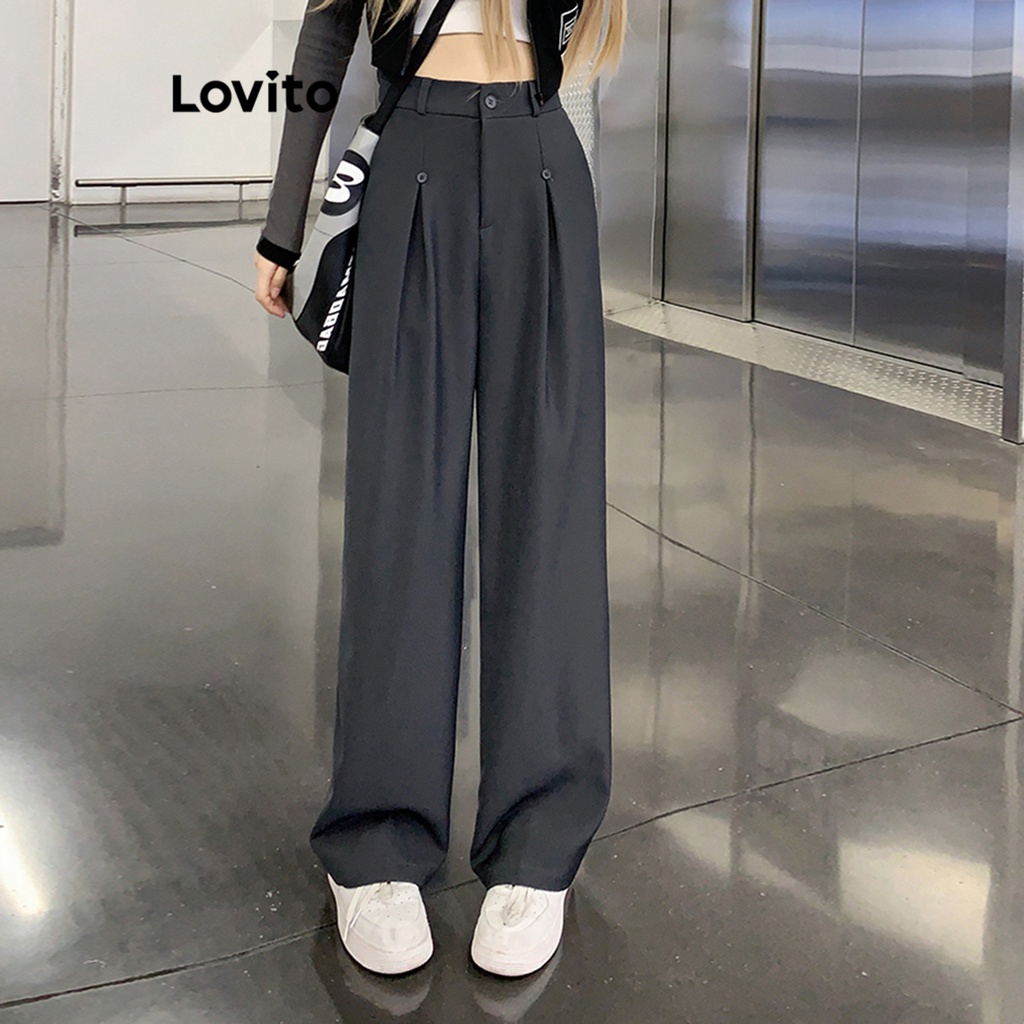 Lovito Calças Casuais Com Bolso Liso E Zíper Para Mulheres LNE35215 (Cinzento Preto)