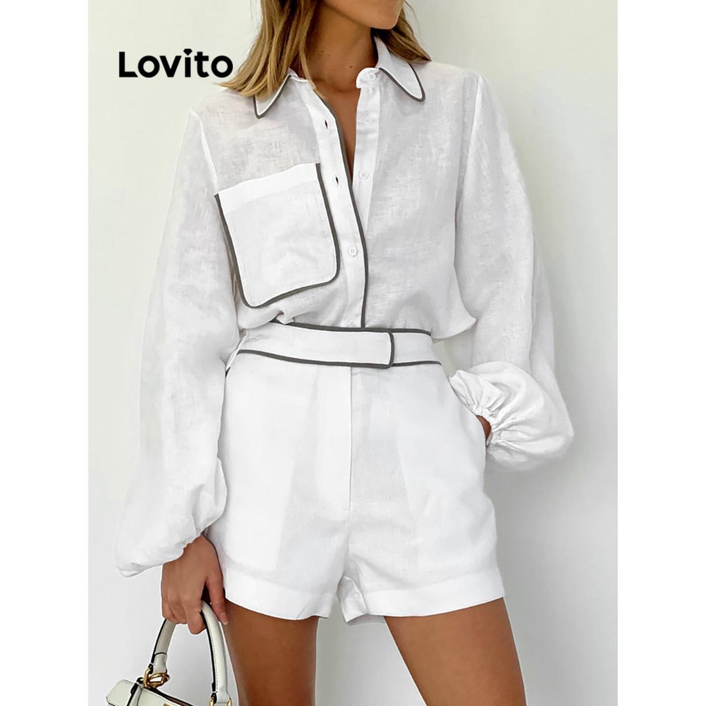 Lovito Conjuntos De Shorts Femininos Casuais Com Botão Liso E Bolso Frontal L65ED104 (Superior/Inferior)