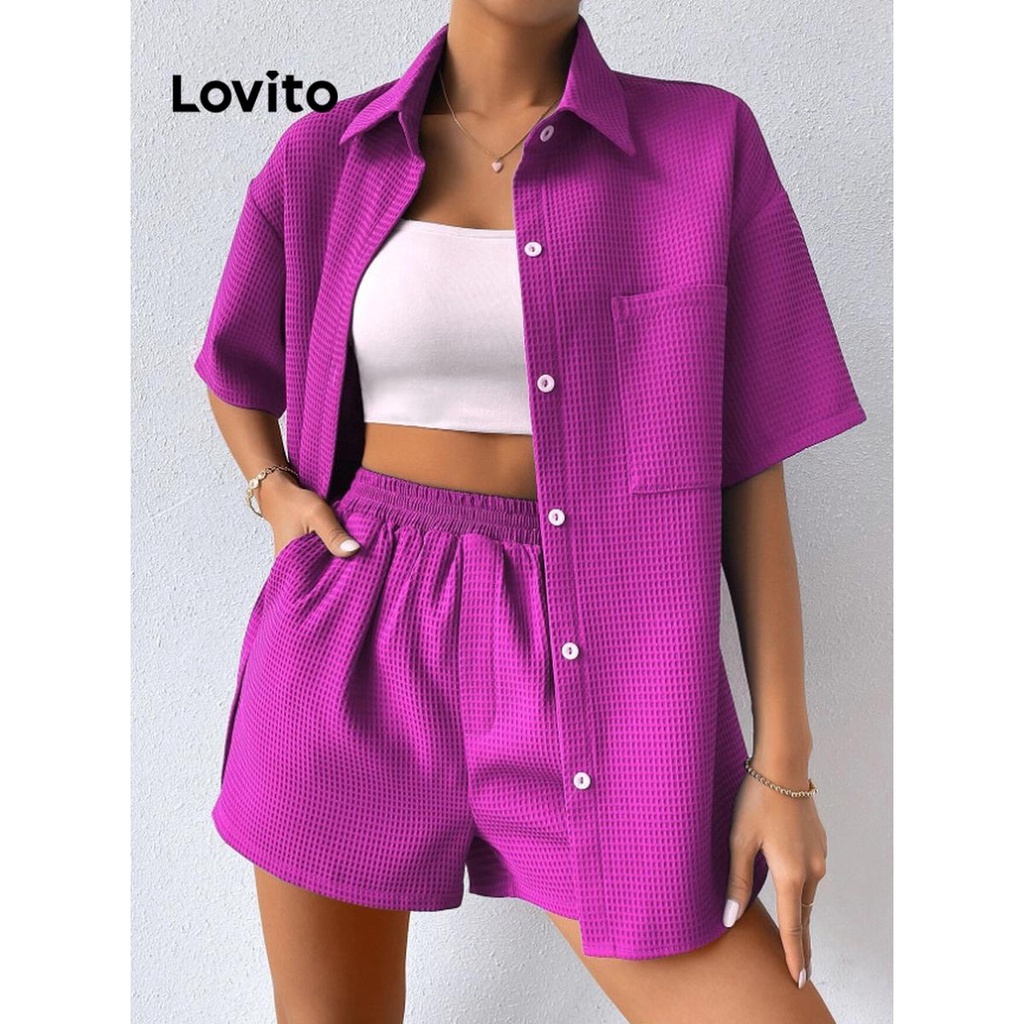 Lovito Conjuntos de shorts casuais com bolso e botão liso para mulheres LBL13459
