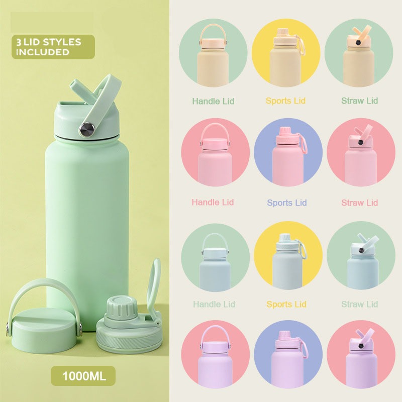 2024 Novo Estilo de copo termostático de aço inoxidável One Cup Três tampas 1L Copo de água de grande capacidade Garrafa de água esportiva portátil para uso ao ar livre