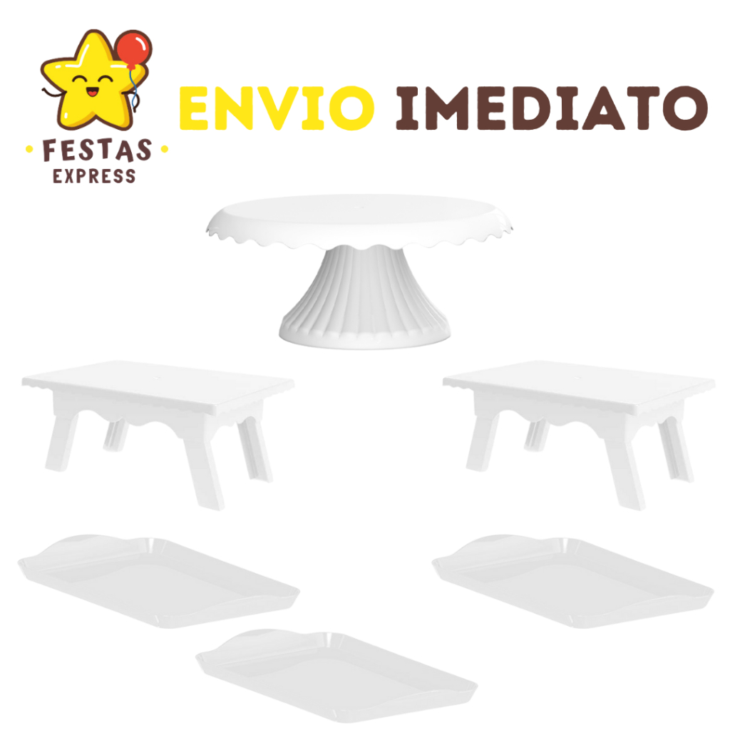 Kit Festa Decorativo - 1 Boleira Cake Renda 19cm , 2 Mesinhas e 3 Bandejas 20x13