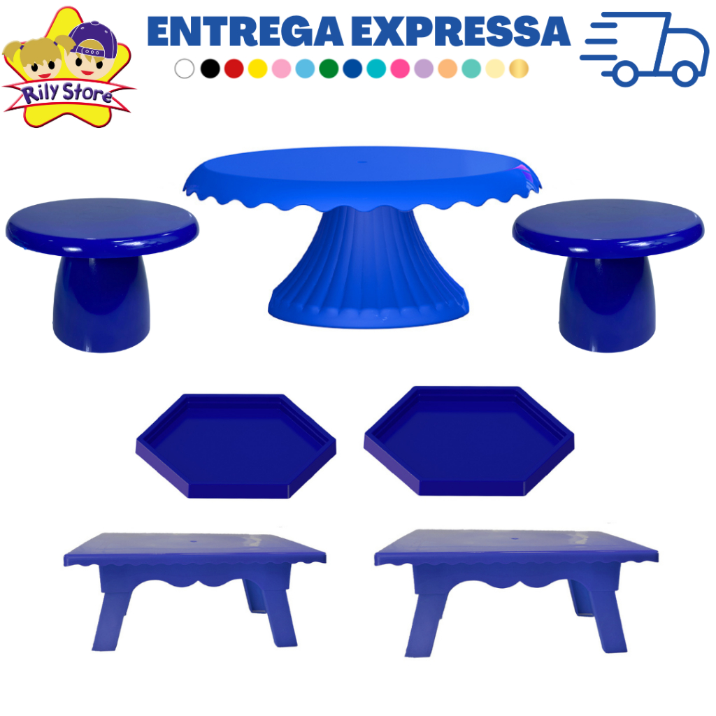 Kit Decor Luxo Festivo Boleira Cake Renda 19cm + 2 Mini Slim + 2 Mini Sextavadas + 2 Mesinhas - Diversas Cores