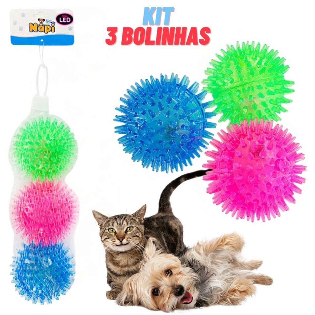 Brinquedo Pet Bola com Luz e Apito p/ Cachorro Cães e Gato KIT 3 Bolinhas Coloridas LED Som e Brilho