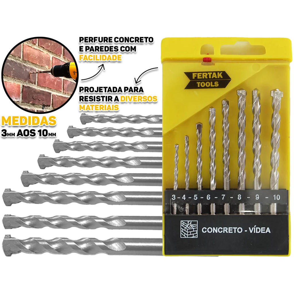 Jogo De Brocas Para Concreto Furadeira Parafusadeira 8 Peças Fertak Kit de Broca De Parede Com Estojo Vídea Profissional