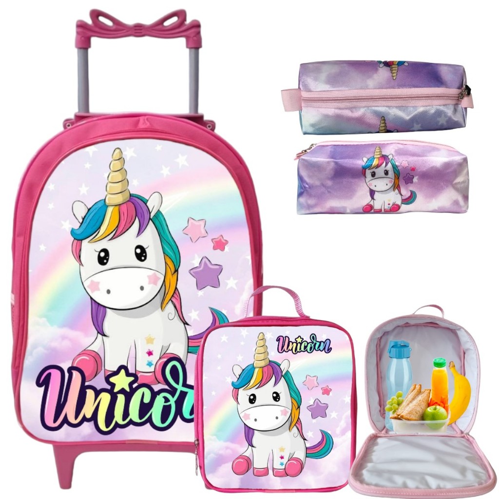 Mochila Escolar Infantil Rodinha Feminina + Lancheira Térmica + Estojo - Unicornio