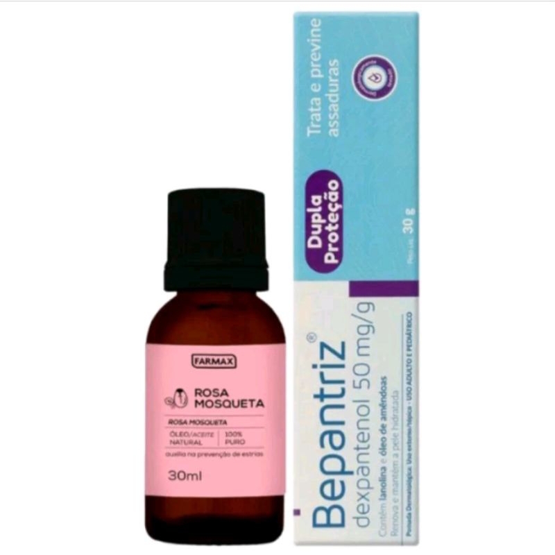 kit óleo de rosa mosqueta farmax 100% puro mais pomada bepantriz cimed clareamento, manchas, antissinais, rugas, linhas de expressão, clareamento facial, rejuvenescimento, pes de galinha