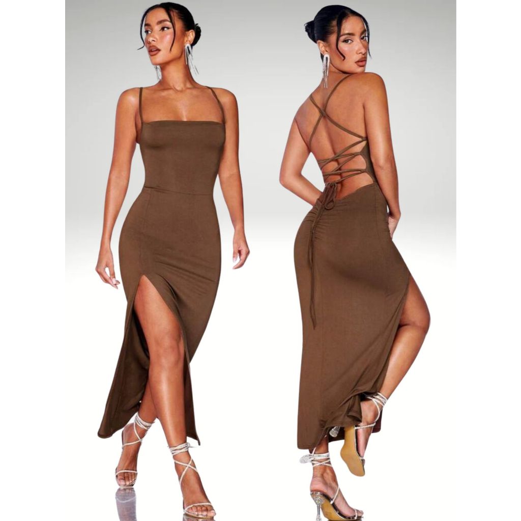 Vestido Feminino Longo Costa Nua Trançado E Fenda Lateral Empina Bumbum