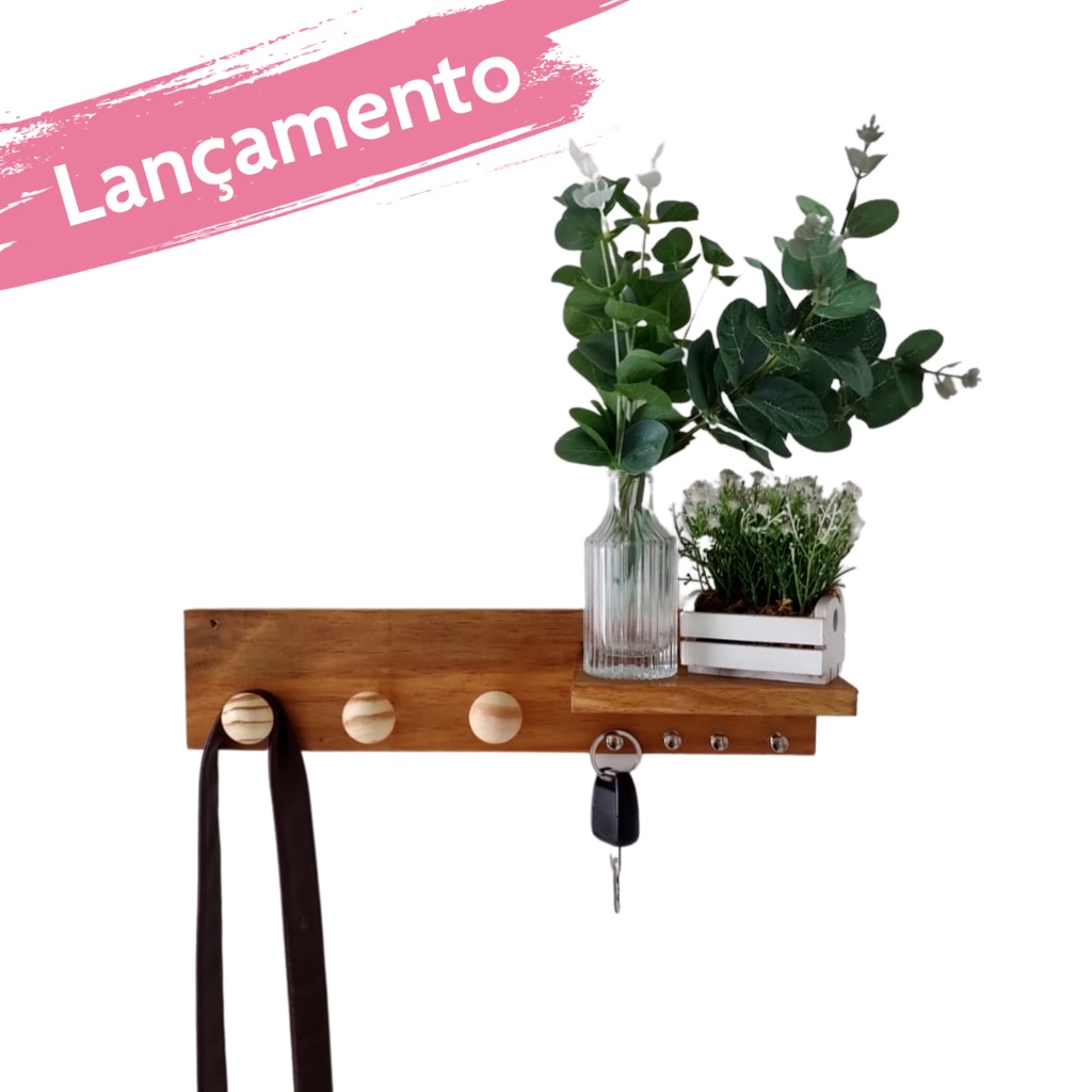 Porta Chaves Hall de Entrada com 3 Cabideiros e Prateleira em madeira Cores