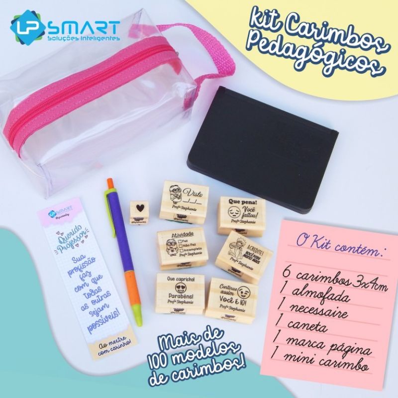 Kit 6 Carimbos Pedagógicos Madeira + Necessaire + Almofada + caneta + marca página + mini carimbo coração