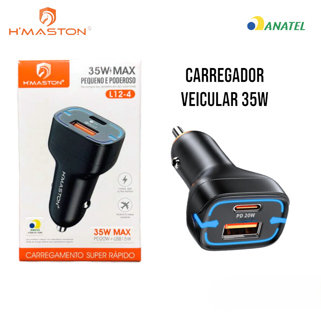 Carregador Celular Para Carro 35W Carga Rápida Entrada USB e Tipo-C H'Maston L12-4