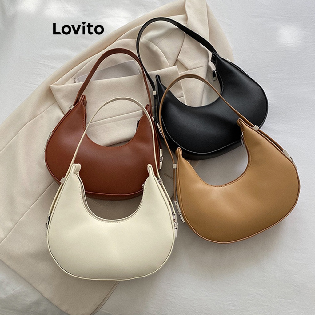 Lovito Bolsa de Ombro Pequena com Zíper de Metal Simples Casual para Mulheres L57AD108 (Caqui/Marrom/Branco/Preto)